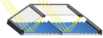 Sunlight enters the MCT panel through the glazing and is reflected off Fresnel mirror strips. The light is then concentrated as it is focused on the receiver.