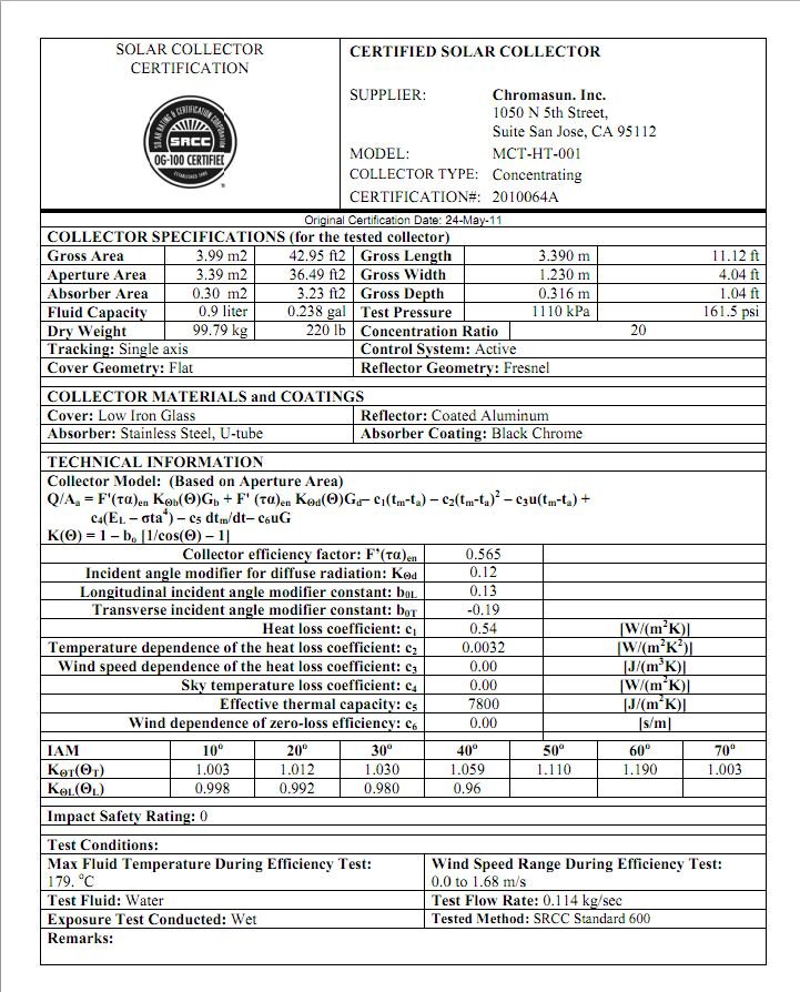 At a constant 176°C (350°F) test temperature, Chromasun MCT-HT acheived the highest temperature rating ever tested under the SRCC Standard 600 "Test Methods and Minimum Standards for Concentrating Collectors”. Chromasun MCT is subsequently certified under OG-100 which is the principal rating for all solar collectors in the United States. Chromasun MCT-HT has also met the EN 12975-2 European Standard for Solar Concentrators.