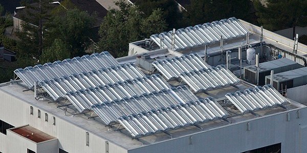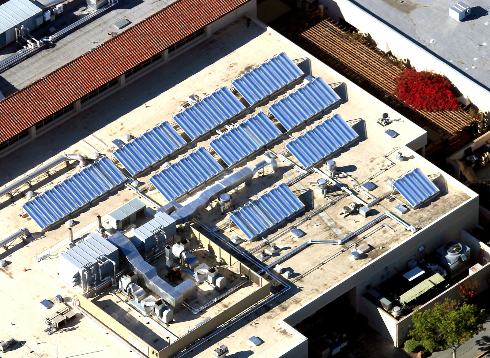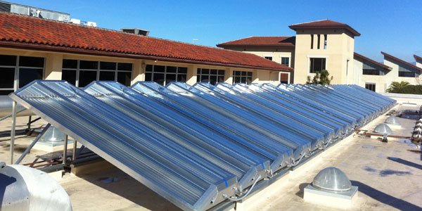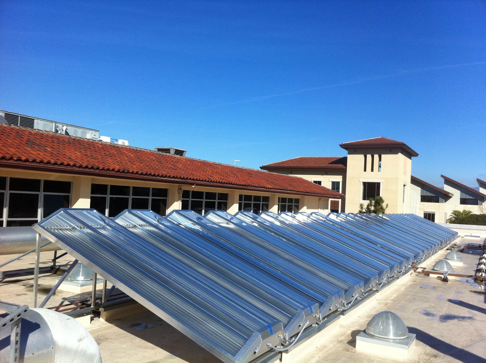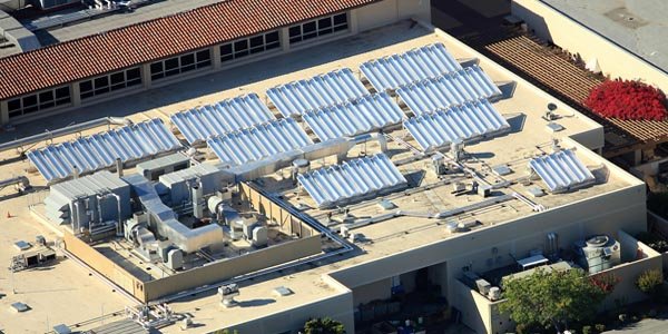 Aerial view of 60 Chromasun MCT panels installed atop the Santa Clara University Benson Building. This installation provides Heating Hot Water and Domestic Hot Water for the University's main cafeteria/restaurant complex.