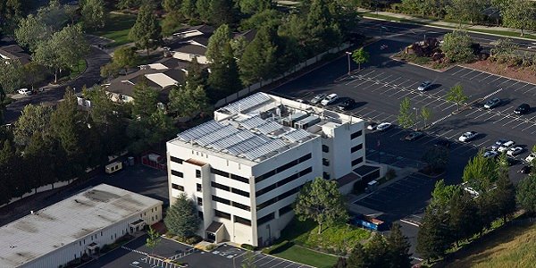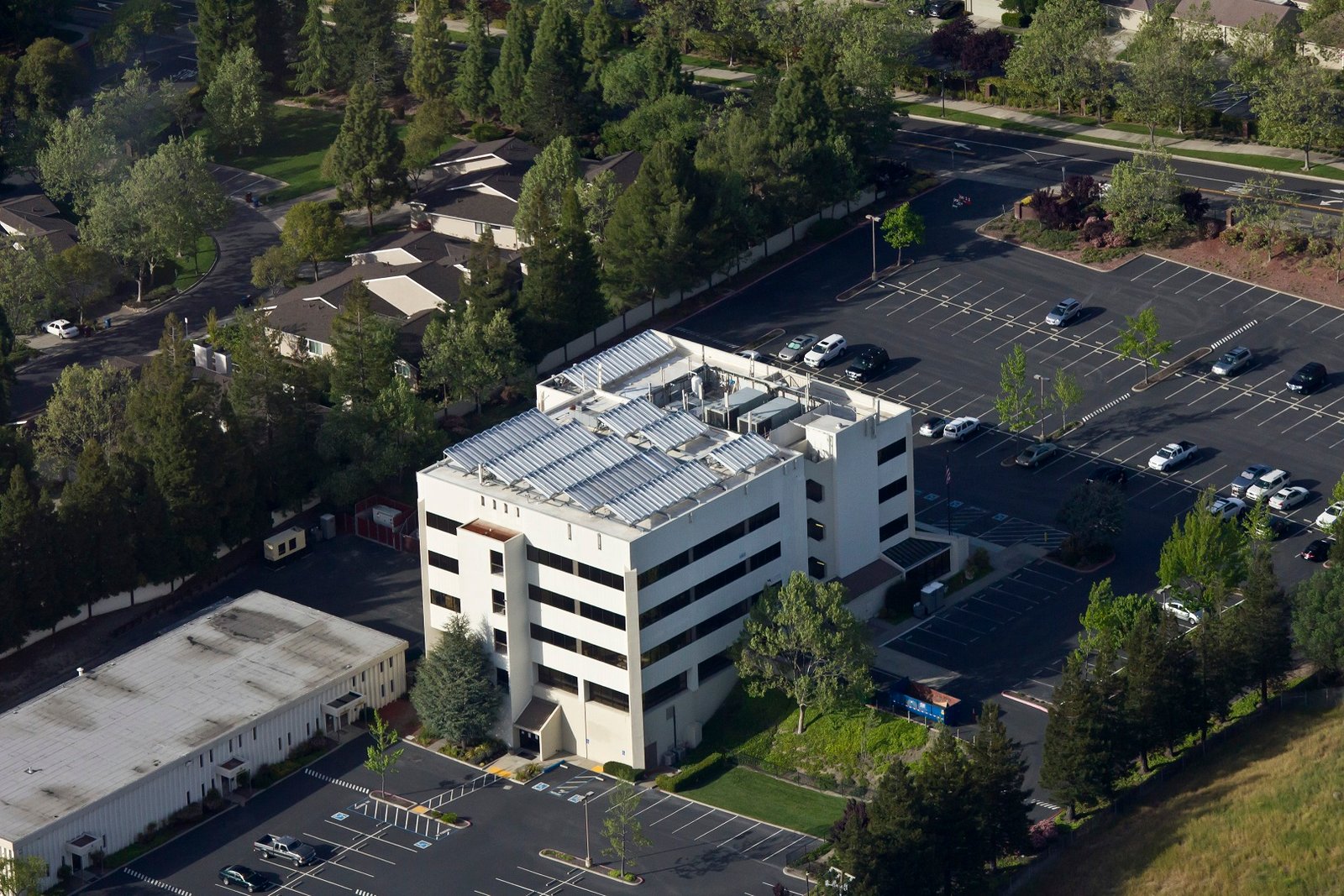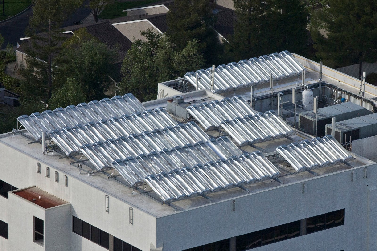 Aerial view of Chromasun MCT panels installed in Danville, California. This project will provide air-conditioning supplementation to the existing DX chillers (visible on rooftop) as well as heating and hot water for the center.